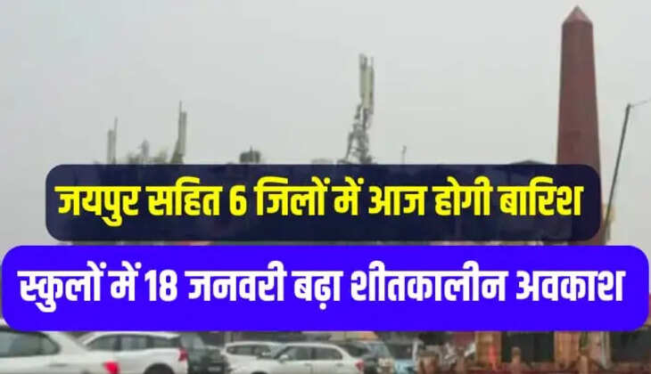 Weather and school holiday update Rajasthan: राजस्थान प्रदेश में कल बुधवार से मौसम ने करवट (Rajasthan weather today) लेना शुरू कर दिया है। 15 जनवरी को प्रदेश के कोटा, चित्तौड़गढ़, भीलवाड़ा, अजमेर, पाली, सवाई माधोपुर और जयपुर सहित कई जिलों में बुधवार शाम से रुक-रुक कर बारिश हुई। वहीं मौसम विभाग ने राजस्थान प्रदेश में जयपुर सहित 6 जिलों में आज भी बारिश का अलर्ट (rain alert in Rajasthan) जारी किया है।