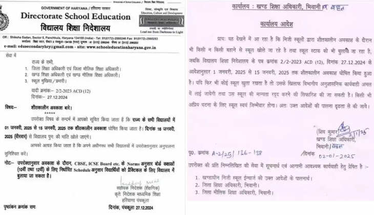 शिक्षा विभाग ने 1 से 15 जनवरी 2025 तक हरियाणा शीतकालीन छुट्टियां घोषित की है यह आदेश सरकारी स्कूलों के साथ-साथ प्राइवेट स्कूलों समेत नर्सरी से लेकर 12वीं तक के सभी शैक्षणिक स्थान पर लागू किया गया है।